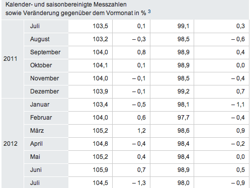 German retail sales fell by 0.9% YoY in July. However the seasonally adjusted number (98.0) is still higher than the figures in February 2011 (97.7).