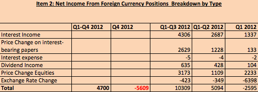 Based on the 5% difference between EUR/USD 1.24 and 1.30 and 40 billion euros exchanged into dollars and pounds, we judge that the SNB made trading gains of 2 billion €, a big part of the 5.2 billion CHF foreign exchange rate income in Q3/2012.
