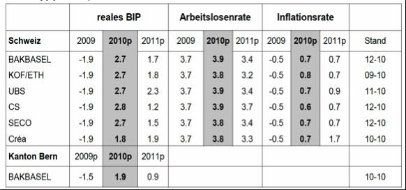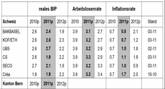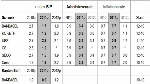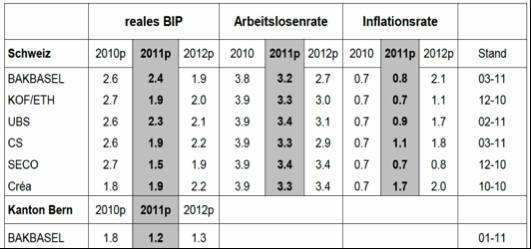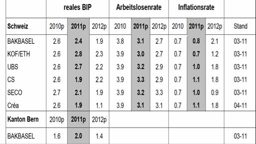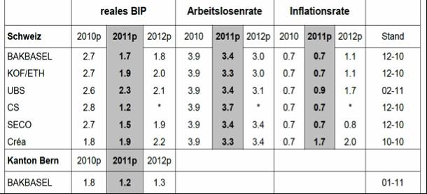 In the picture gallery, the reader can see the estimates by different Swiss economic institutes. The actual GDP growth for 2010 was 3.0%, the seasonally adjusted unemployment 3.6%. The 2011 growth rate 1.9%.