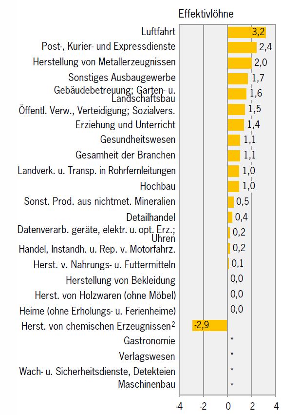 Swiss statistics published the 2012 survey of Swiss wages. Paid wages per hour (“Effektivlöhne”) rose by 1.1% in the year 2012, while they went up by 1.0% in 2011. The graph shows the increases by sector. Some like machinery or tourism saw no change, because they still fight with the (for them) strong franc. Working hours in the chemical and pharmaceutical industry increased due to higher demand, resulting in a fall in hourly wages (-2.9%).