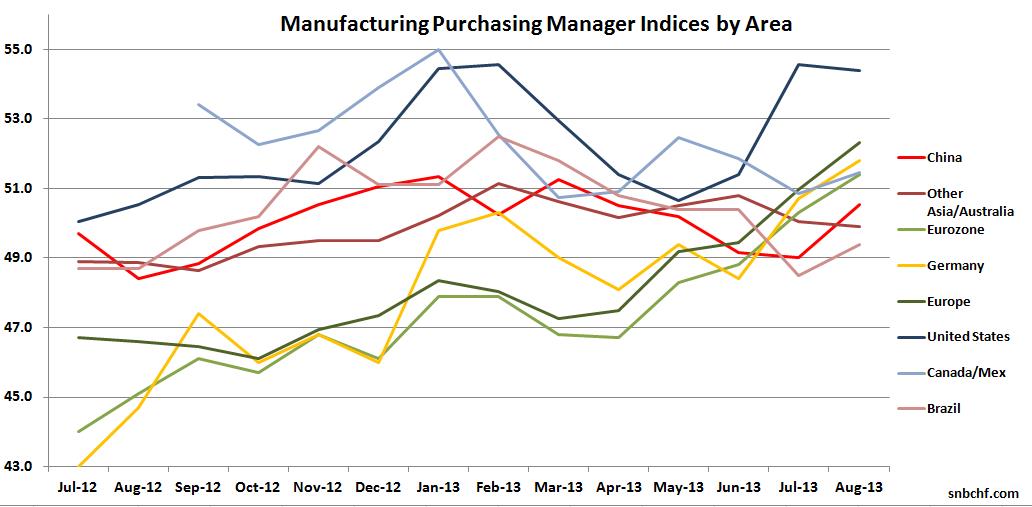 The following graph shows the average PMIs for the different geographical areas. The picture clearly shows that the speed of the U.S. recovery has slowed, while Europe and China are catching up now. Emerging Markets hit most by rising wages like Indonesia, India and Brazil have still issues.