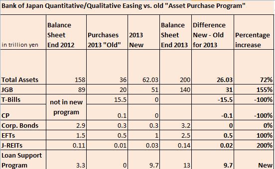 The Bank of Japan has introduced the expected “massive” quantitative and qualitative easing programme. “Quantitative” means increase of quantities of JGBs bought, “qualitative” the purchase of more ETFs, REIT and the loan support program.