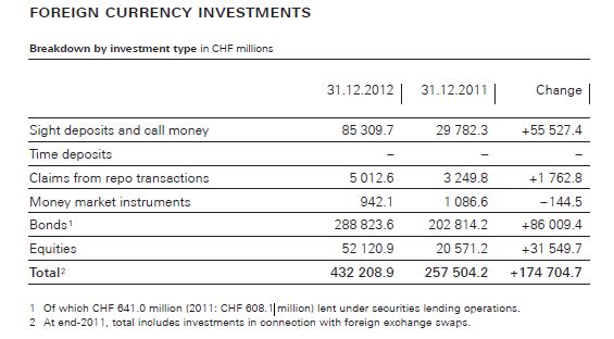 The share of fixed income positions with ratings below A increased to 4% thanks to higher valuations of Italian and Spanish bonds (see Q4/2012 data below). The share of AAA bonds, however, fell by 2%. The bank increased the equity share of her portfolio massively from 12 to 15%. Given that at the end of 2012, the bank possessed 52 bln. CHF in equities (see below), the equivalent of 12%, this should have increased to 65 bln. francs to achieve the 15% share.