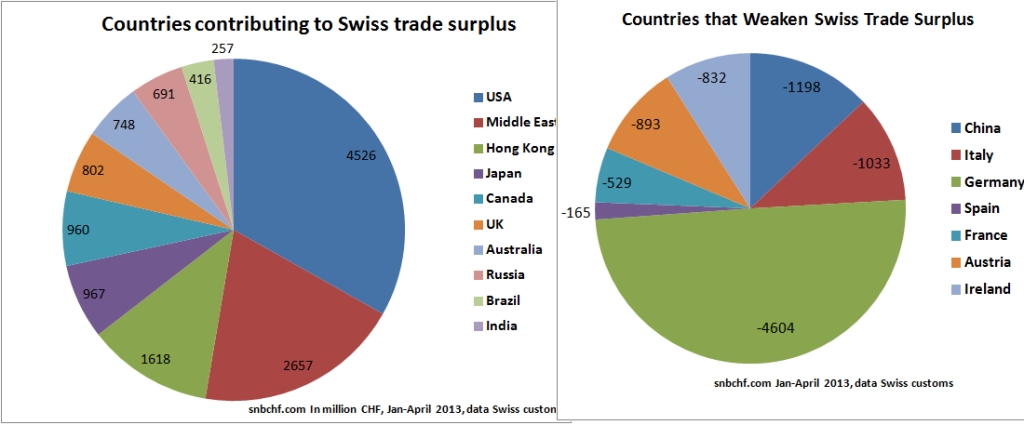 The Swiss trade balance for goods clearly indicates its global orientation. Switzerland has a trade surplus with the US, Canada, the UK and many emerging markets. Swiss exports are mostly luxury products and pharmaceuticals. The total surplus for the 4 first months in 2013 was 7.7 billion CHF, about 1.2% of GDP, annualized around 4%.