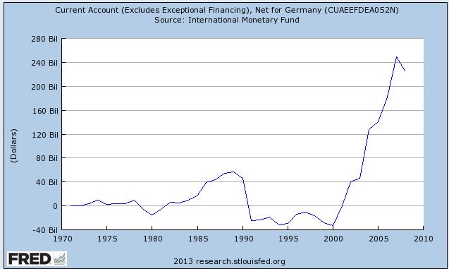 A decade of weak German spending, private debt reduction and huge current account surpluses followed.