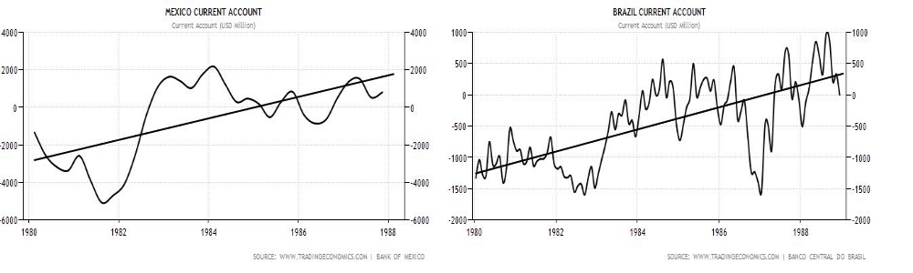 Between 1983 and 1985, one reason was the high real interest rates in the U.S. after the defeat of the Great Inflation period, the enforced austerity in South America and cheap commodity prices caused by generally low global growth.