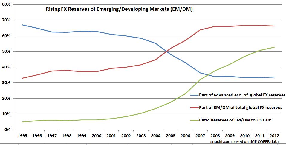 From 2001, emerging markets were progressing and increasing their wealth, FX reserves of emerging and developing nations rose from 5% to 50% of US GDP. The success of emerging markets drove commodity prices up and the dollar fell even more.