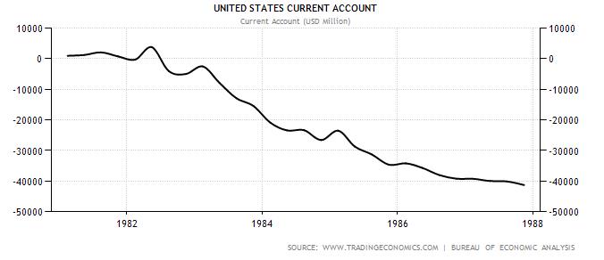 Despite cheap oil prices the U.S. was spending and increasing current account deficits. The dollar reached a top in 1985, when central banks stopped the dollar strength with the Plaza Accord.