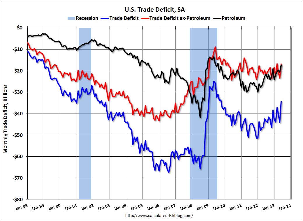 The United States trade balance has strengthened to a deficit of only -34.2 bln USD in June 2013. This is nearly half the record-high trade deficit of 62 bln. $ in August 2008 and not too far from record-lows of 26 bln. $ in July 2009, when oil was really cheap.