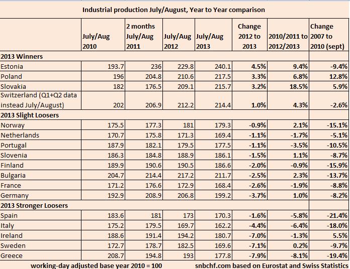 Based on Eurostat’s industrial production for July and August , we compared the values from 2010 to 2013 for these two summer months. This aggregated two-months comparison is commonly used because data for one single month is often subject to fluctuations. We added the data from Swiss Statistics. Since only quarterly data is available we added the first and the second quarter of the years 2010 to 2013, available here.