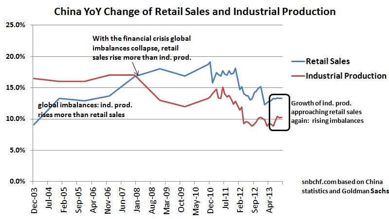 Chinese industrial production inched up 10.3% y/y, more than the 10% expected, while retail sales increased 13.3%. The growth rates of industrial production and retail sales are getting closer: this means rising global imbalances.