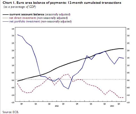 After the record-highs in Spring 2013 of 17 bln.€, per month, the September trade surplus in goods and services for the euro area fell to levels of 14.3 bln. €, which is 1.8% of (monthly) GDP. The recent tendency, however, was for rising European exports, while the contraction of imports seen until the spring stopped. The continuing European recovery attracted more foreign (e.g. American) portfolio inflows and sustained the euro.