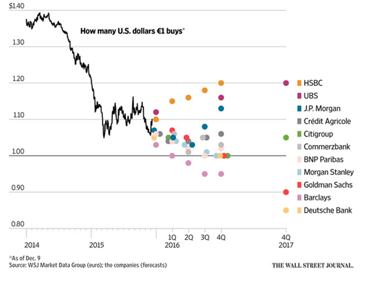 Dollar bullish sentiment prevailed in 2015, but many large banks doubt that it will continue in 2016. This Great Graphic from the Wall Street Journal shows the euro forecasts of eleven major banks.