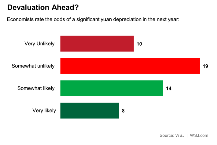 This Great Graphic from the Wall Street Journal shows that economists are divided on the outlook for a significant devaluation in 2016. It is not clear from the article precisely what is meant by a "significant" devaluation. Roughly 57% of the surveyed economists think that significant depreciation of the yuan is very or somewhat unlikely, while 43% think it is somewhat or very likely.