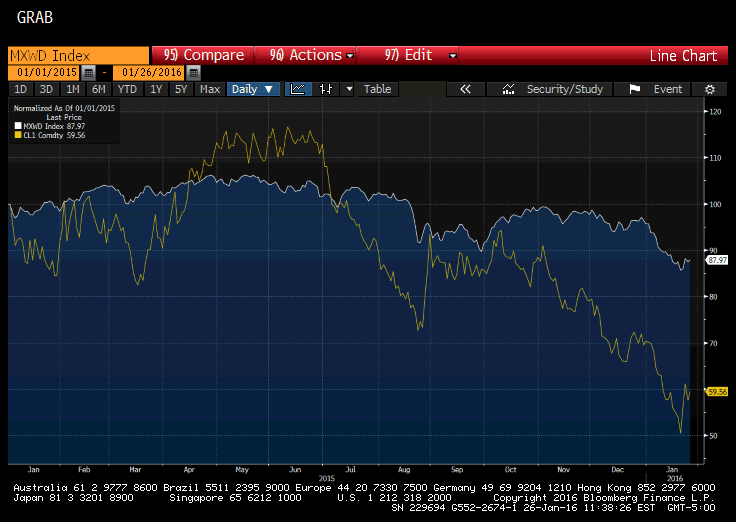 First we need to break out of the habit of thinking that relationships can be simply eyeballed by looking at a chart. This first Great Graphic is typical of charts some analysts and reporters are showing. The white line shows the MSCI free-float weighted index of world equities (emerging and developed markets). The yellow line is the continuation contract for light sweet crude oil. It appears to be a good fit.However, in this form, it is too much of an exercise in curve fitting. There are two time series and two different scales. There is no objective reason to line up the two time series so that 400 on the equity index is almost $45 a barrel for oil, or why 360 on the index is roughly equal to $27.50 on oil. It looks more pleasing to the eye, but this is not a beauty contest.