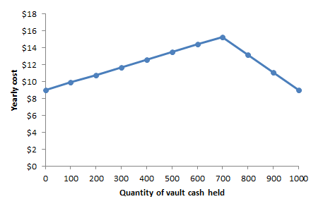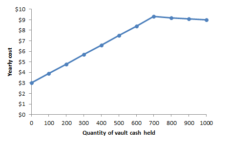Notice that the graph is kinked. When a bank has replaced $700 in deposits with cash, additional cash withdrawals actually reduce its costs. This is because once the first tier, the $700 shield, is used up, the next deposit conversion reduces the second tier, the exposed portion, and thus absolves the bank of paying interest costs. And since interest costs are larger than storage costs, overall costs decline.