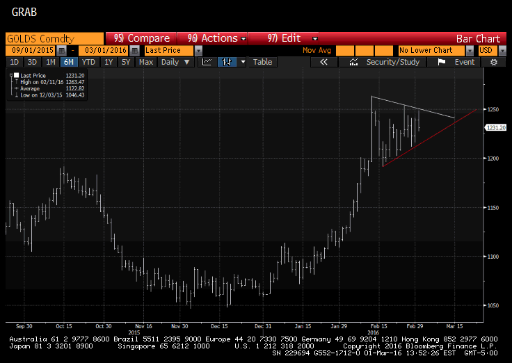 The increasingly precious metal rose to almost $1263.5o on February 11. Since then, it has been carving out a symmetrical triangle pattern, as depicted in the Great Graphic here (that was composed on Bloomberg). The symmetrical triangle is most often a continuation pattern. Occasionally, it is a reversal pattern.