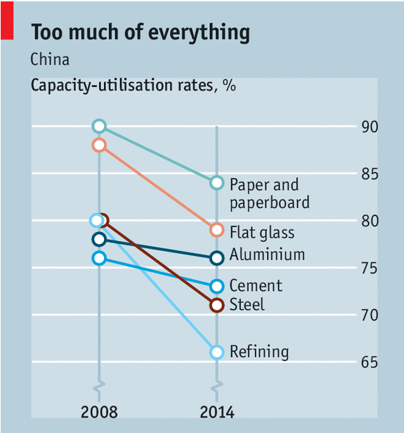 This Great Graphic from the Economist shows the capacity utilization rates of several industries. Those industries that China has excess capacity become vulnerable globally. Take steel as an example. China's spare capacity alone outstrips US, German, and Japanese annual steel output. This is not just slow growth, but the world can produce more steel than it can consume. Lower capacity usage is linked to lower profit margins. An industry group cited by the Economist found that steel capacity rose by 57% in the decade through 2014. China alone accounted for more than 90% of the added capacity.