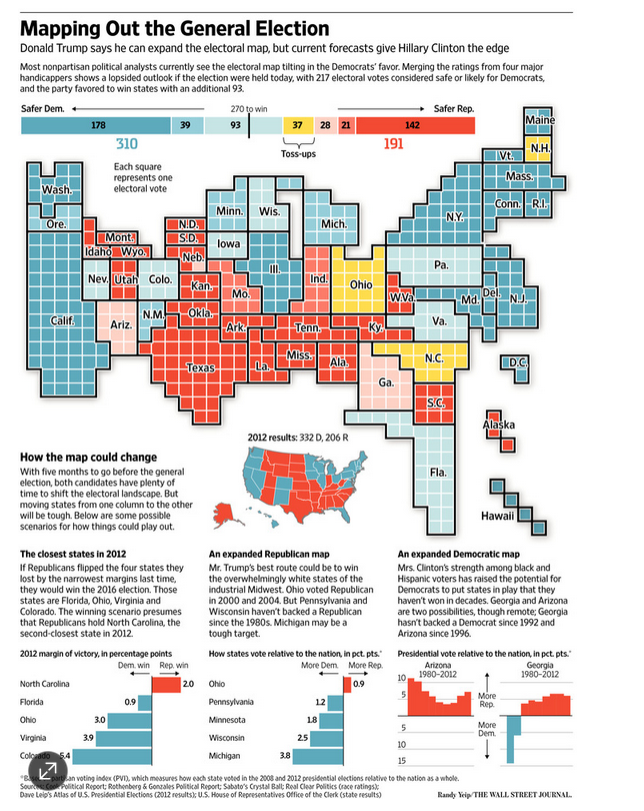 This infographic was in the Wall Street Journal on the US election.  It is important to remember that the US does not elect the President by direct popular vote.  This makes the national polls a bit misleading.
