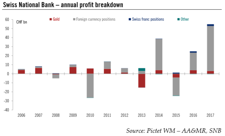 | The Swiss National Bank (SNB) published its 2017 annual result today. The SNB confirmed a profit of CHF54.4bn in 2017. This was more than double the 2016 figure (CHF24.5bn) and its biggest profit ever. Earnings from the SNB’s foreign currency positions amounted to CHF49.7bn, its gold holdings increased in value by CHF3.1bn and its Swiss positions by CHF2bn (see Chart below).