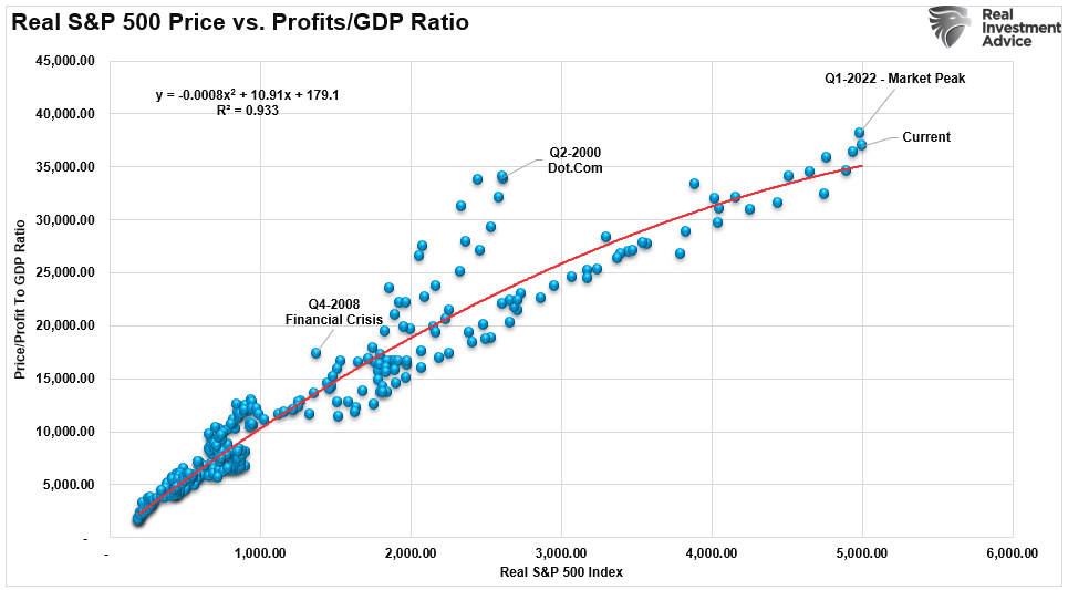 As such, given the high correlation between the market and the corporate profits to GDP ratio, as is currently the case, markets can detach from underlying economic realities due to momentum and psychology for brief periods. However, those deviations are unsustainable in the long term, and corporate profitability, as discussed, is derived from underlying economic activity.