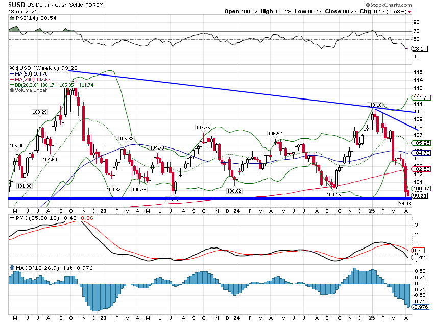 The US dollar is in a downtrend. I’ve been reluctant to say that out loud because we’ve been in a range for the last almost 3 years and we still are, although barely. But with the dollar now down over the 1, 3, and 5-year time frames, one can no longer say the dollar is in an uptrend. You can say that, at these levels, it remains fairly strong, but you can’t call that an uptrend. In fact, the dollar index is negative over the last 8 years, if only slightly. So, yes, we are in a downtrend, albeit a weak one. The question though is whether that will continue and while I can’t predict the future, that is certainly what I expect. I guess I should say that that has been my expectation for some time so maybe readers ought to take my opinion with a grain of salt, but the rise in gold over the last few years is sufficient, at least in my mind, to justify that expectation.
