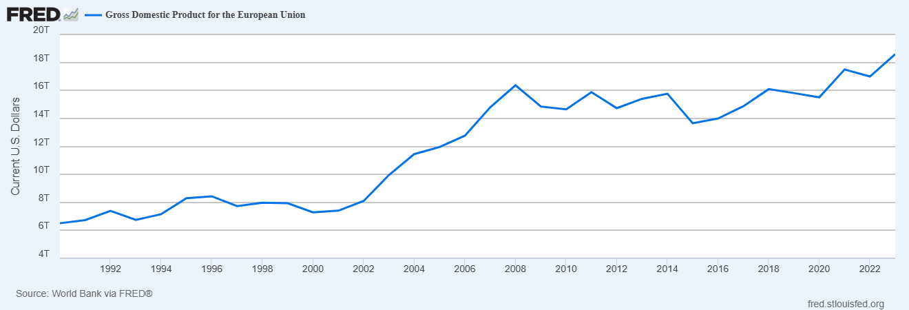 While US GDP recovered its 2007 peak by early 2010, the EU didn’t fully recover until 2012 (in Euros). In dollar terms, the EU economy peaked at $16.365 trillion in 2008 (larger than the US at the time of $14.898 trillion) but didn’t recover that level until 2021: