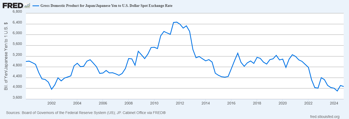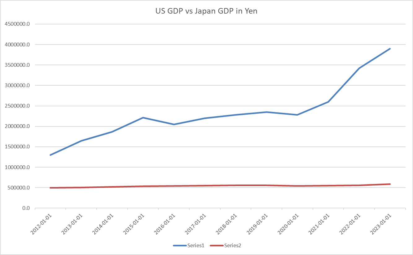 The difference is even more stark in Japan. The US economy grew 3.7 times in Yen terms from 2012 to 2023 but Japan’s GDP barely budged.