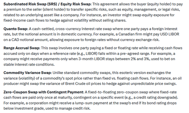 It's worth sharing that there are many other types of swap contracts. Here are a few of the more complex agreements, courtesy of Grok.