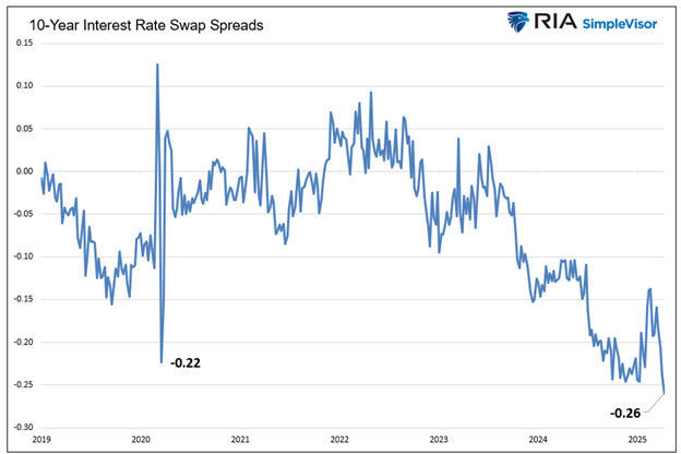 Oftentimes, liquidity problems show up in the more popular stock and bond markets well after they expose themselves in other markets, such as interest rate swap agreements. As we graphed, interest rate swap spreads have declined into negative territory for over three years.