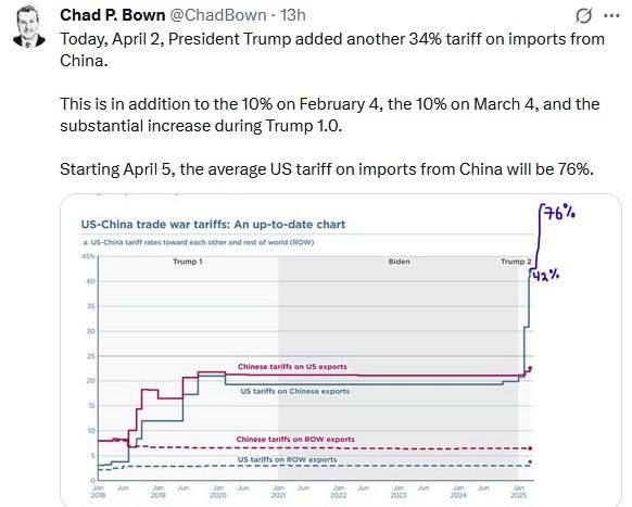 Shortly after the tariff rates were announced, the math behind the calculations was revealed. Thus, we have learned that the administration took the US trade deficit with each country and divided it by our imports from that country. The chart below shows predictions based on the formula plotted against the new tariff rates.
