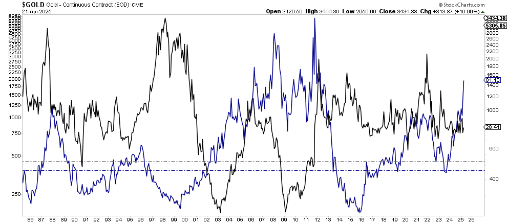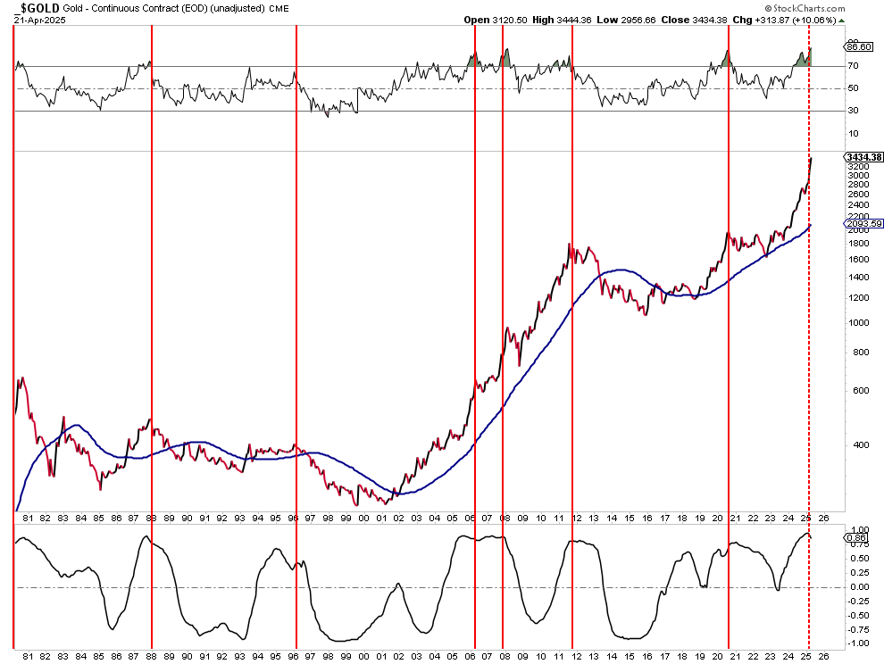 Tagging on to Michael's opening comment on gold above, the chart below shows how extreme the current move has been and why, in the coming weeks, we will likely begin taking profits from our gold holdings in our "All-Weather" portfolio. The chart below is MONTHLY, so it is very slow to move. However, with relative strength now at levels rarely seen historically, a mean-reversion is becoming increasingly likely. While it may seem "impossible," a correction back to 2100-2200 is entirely possible.