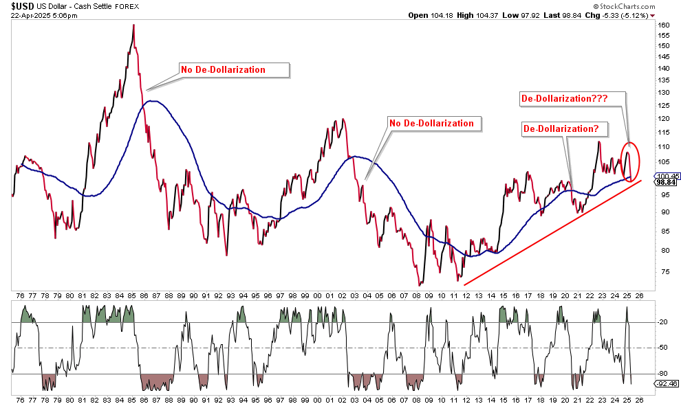 The graph below shows the range of weekly dollar prices by year since 1971. The black line is the year-to-date price change. The -10.16% decline over the first 16 weeks of the year is the worst in the last 54 years. While the dollar's decline can certainly continue, especially if little progress is made on tariffs, the historical decline thus far like fortells that at a minimum, a rally is overdue.