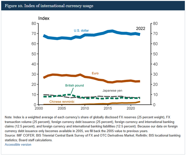 The graph below, courtesy of the Federal Reserve, shows how the dollar's usage in global transactions has been stable for the last two decades. The index calculation, as detailed at the bottom of the graphic, is based on the primary uses of currencies.