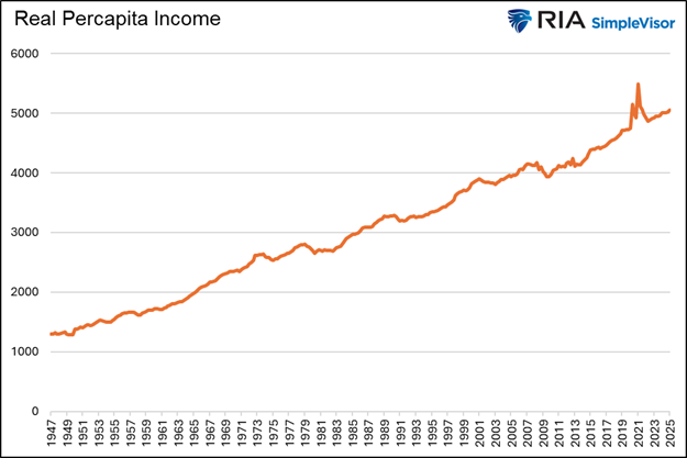 Although decades of inflation have drastically eroded the dollar's value, our standard of living has risen appreciably. To wit, the purchasing power of one dollar in 1947 has eroded to 7 cents. However, as shown below, inflation-adjusted incomes have risen fivefold since 1947. The dollar buys less, but our incomes buy more!