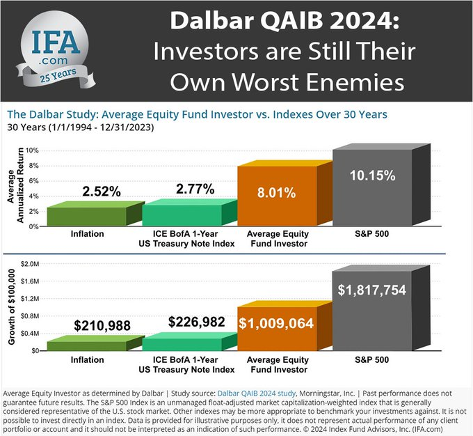 Pursuing benchmark-beating returns can lead investors into dangerous territory. Studies in behavioral finance (Statman, 2000) show that investors chasing outperformance often engage in high-turnover strategies, excessive trading, and speculative bets. These behaviors introduce additional risks and higher transaction costs that erode potential gains. The result is that investors, while trying to "beat the index, " consistently underperform over time. As noted in the 2024 Dalbar Research report:
