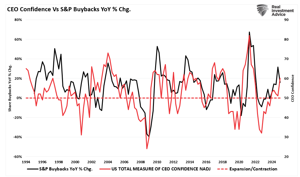 Of course, one misnomer is that corporate CEOs execute buybacks when they believe the stock is undervalued. However, the reality is quite the opposite, and they tend to execute share repurchases when their current optimism is elevated. When share prices decline, and buybacks could be done at accretive prices, there is little incentive to do so.