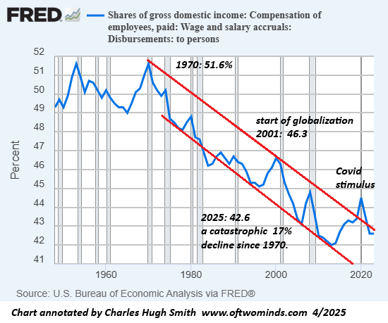 Beneath the endlessly hyped "growth" of the economy, precarity and immiseration are the order of the day for the bottom 60% as wages' share of the national income has continued its 50-year decline.