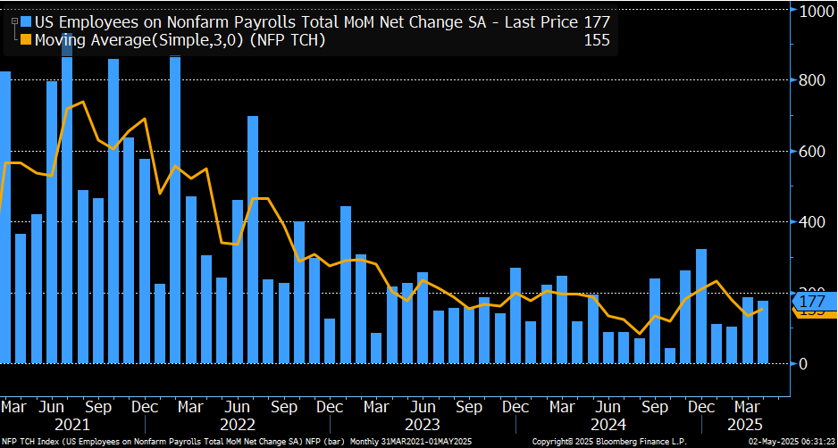 The economy added 177k jobs last month, about 35k above estimates. However, the two prior months were revised lower by 58k jobs. The unemployment rate was unchanged at 4.2%. As judged by this report, the labor market seems in good health, albeit slowing.