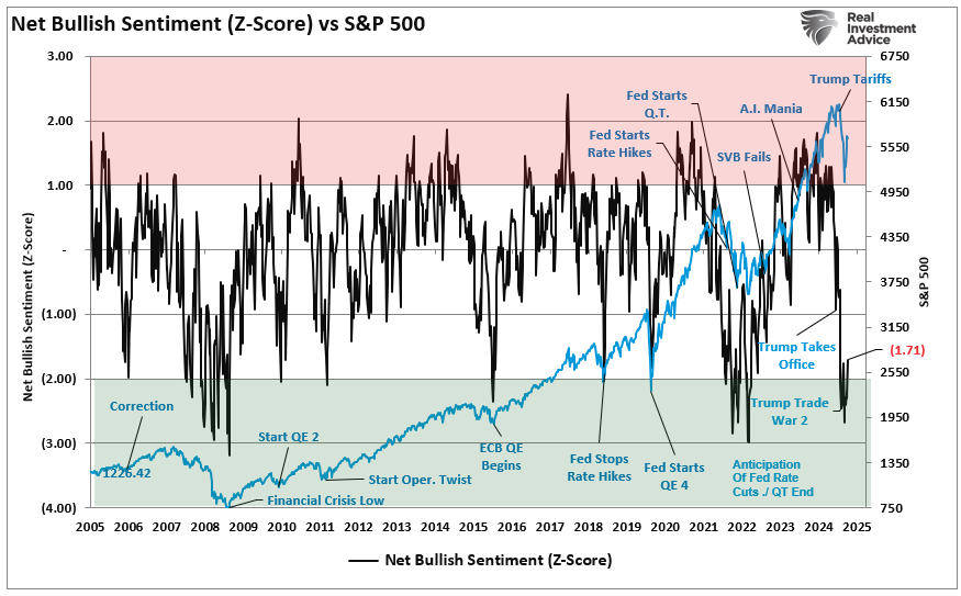 As shown on the weekly chart below, the market has recovered from a test of support at the two-standard-deviation level below the 4-year moving average. If we assume that we are not involved in a more protracted process as in 2022, previous tests of two-standard-deviation declines were market bottoms before the bull market resumed. We saw similar tests in 2016, 2018, and 2020. In those cases, the weekly MACD signal declined, and the reversal marked entry points previously.