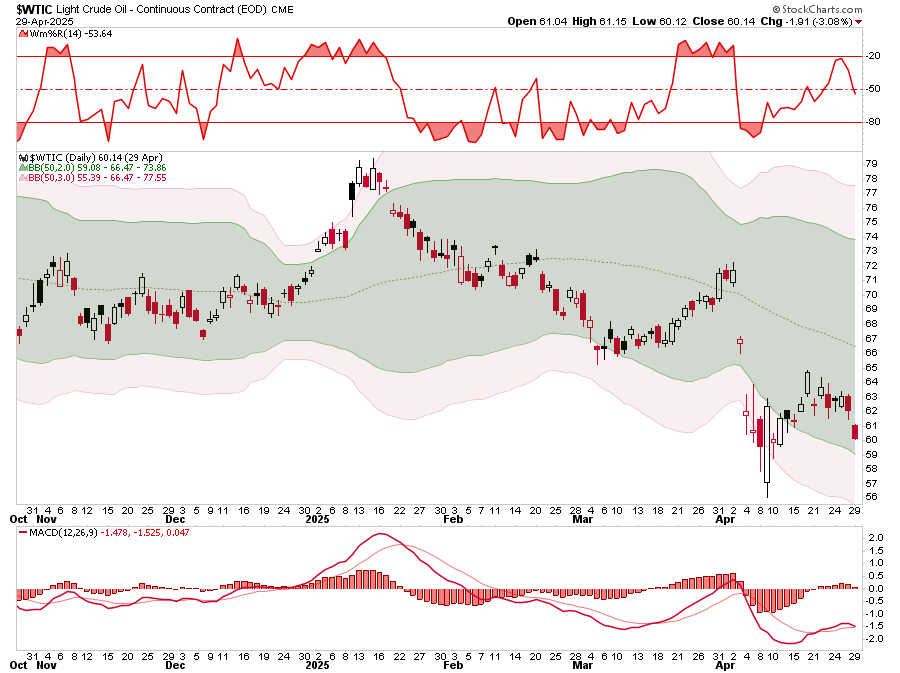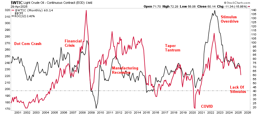 One thing we are watching very closely now is oil prices, which remain under pressure. Oil prices are back to pre-pandemic highs, and the risk is a break into the low 50s. The problem with oil is that the President wants to "drill-baby-drill," which will increase supply amid weakening economic demand. Such will result in lower prices, and push-back from oil producers who won't drill low-profitability wells.
