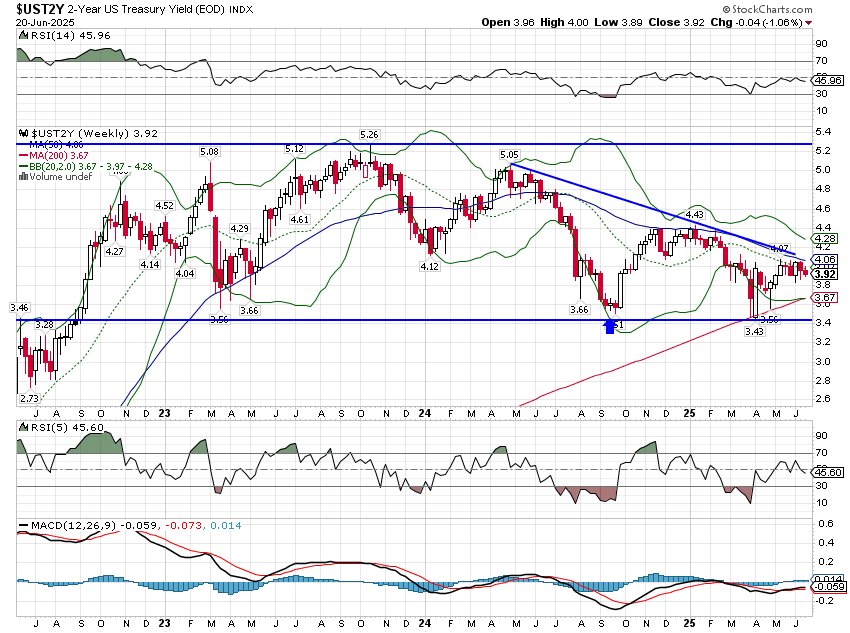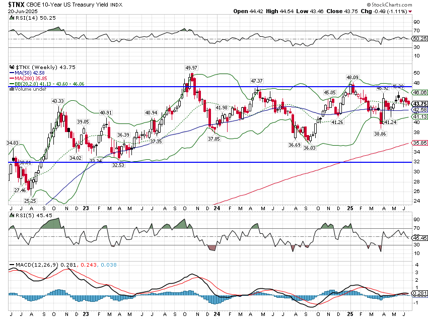 Along with Israel/Iran, the economic data has recently trended in the less-than-expected direction and bonds managed a gain but it wasn’t very impressive; the 10-year Treasury yield is still – still! – in the same range its been in for going on 3 years. Are bonds also anticipating a weaker dollar and the inflationary implications of that? 10-year inflation breakevens are up 16 basis points since mid-April and that’s in the wrong direction but it’s also too small a move to draw any conclusions.