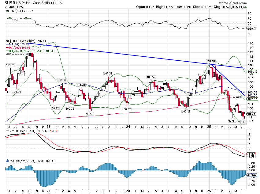 Israel and Iran are going at it every day and all the dollar could manage was a measly 0.5% gain on the week. Nevertheless, I do still expect a rally though as sentiment has just gotten too bearish; is there anyone who likes the dollar right now? On the other hand, I think the longer term trend is changing and any rally will be limited. President Trump is doing everything in his power to weaken the dollar and eventually he will succeed.