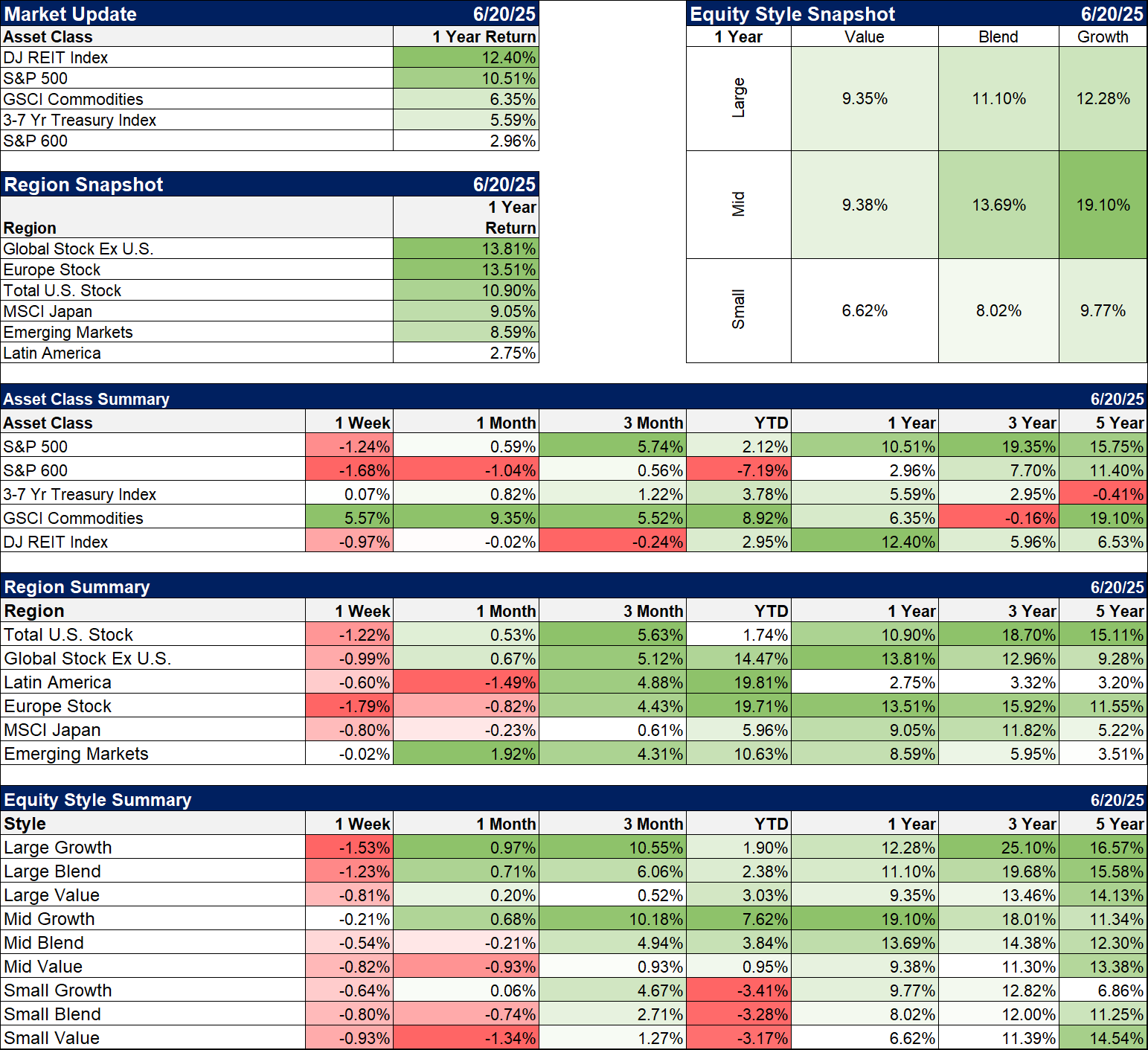 Stocks were down last week but diversified investors benefitted from a rise in commodity prices and a small gain in bonds. You see a similar benefit in the 5-year numbers where commodities are the best performing asset class. Over the last year, the multi-asset class portfolio has benefitted from exposure to REITs which have handily beaten the S&P 500. If you can’t predict the future – and no one can – a diversified portfolio is your best defense – and offense.