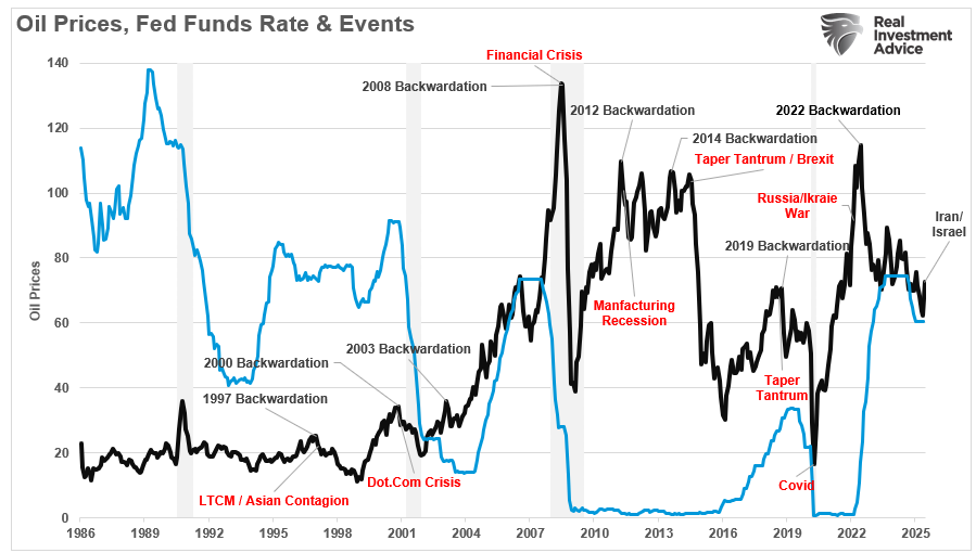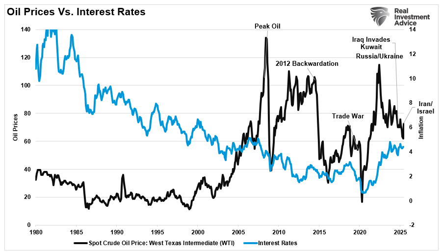 While the oil price rise is certainly a worry, as it increases the burden on individuals, will it lead to a rise in the Consumer Price Index (CPI)? This is an important question, given that following the Federal Reserve meeting this week, its outlook for "tariff-driven" inflation remains unchanged. However, after four straight months of lower-than-expected inflation prints, that "tariff-driven" inflation has yet to appear amid slowing economic data. While it would seem the Fed should be cutting rates, the recent oil price rise may vindicate them with a short-term pick-up in inflation.