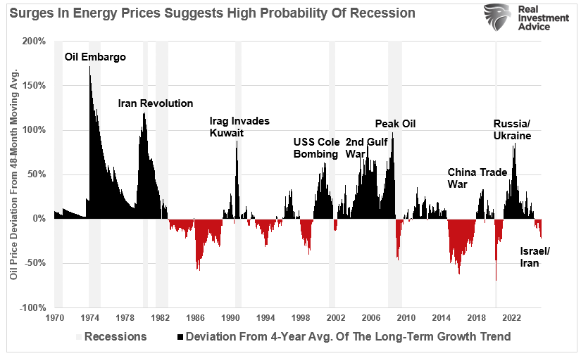 The chart below shows the historical oil price rises as a percentage change from the 4-year moving average. As noted, significant percentage increases typically precede recessionary onsets as the increased tax impacts the consumer. However, the recent price increase due to the Iran/Israel conflict does not suggest that any recession risk is present.