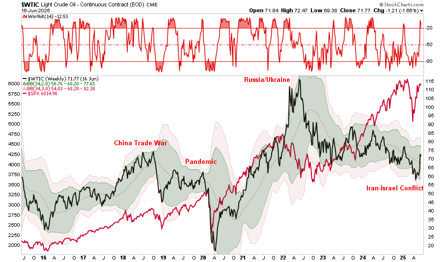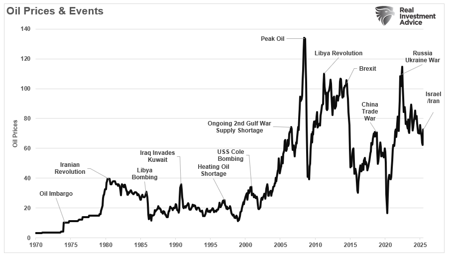 This past week, the oil price rise caused by the outbreak of the Iran/Israel conflict caught investors' attention. However, as is always the case, it is important to keep price movements in context. As shown in the chart below, oil prices had become oversold early in the year as concerns of recession increased. Notably, oil prices, while not more extremely overbought, are moving in that direction. While there is much arm-waving and hand-wringing about the current oil price rise, oil remains in a broad downward trend from the 2022 Russian/Ukraine invasion.
