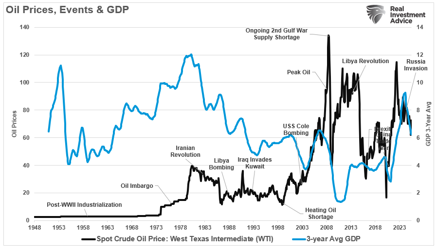 Most critically, when events such as the Russia/Ukraine invasion lead to a sharp increase in oil prices, the impact is immediate on the economy, but also short-lived. As the economy slows, demand falls, and oil prices contract due to the increased tax on consumers. As such, media-driven narratives about a "new future" of $100/bbl oil always fall short of reality due to the lack of consideration for oil prices' tie to economic activity.