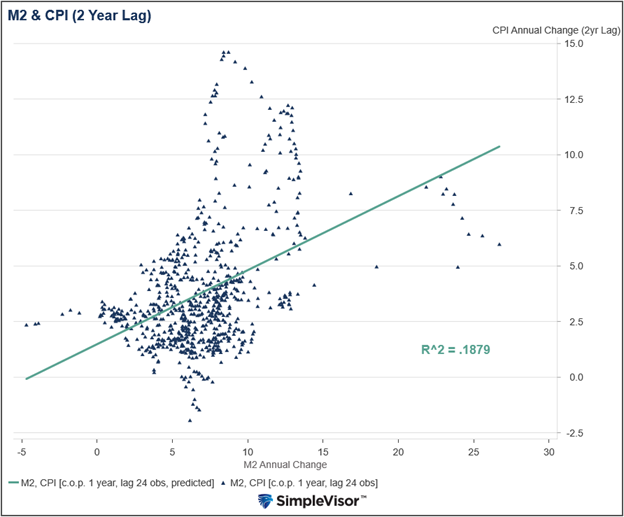 The scatter plot below charts the annual changes in CPI and the money supply (M2) since 1970. We lag CPI by two years, as it provides the most robust statistical relationship, albeit one that is relatively weak, as indicated by its R-squared value. The reason for the poor correlation is that monetary velocity, a measure of how quickly money circulates throughout the economy, is also a key driver of inflation.