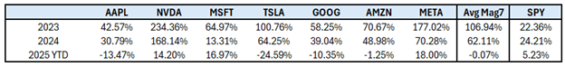 In 2023, the "Magnificent Seven" (NVDA, META, TSLA, AAPL, MSFT, AMZN, and GOOG) became a popular nickname for the seven largest stocks by market capitalization. “Magnificent” was used because these stocks led the S&P 500 higher throughout the year. These same stocks had a strong showing again in 2024, as all seven were among the top ten contributors to the index that year. It's fair to say that investing in the Magnificent Seven was one of the best strategies and most popular trends during those two years.